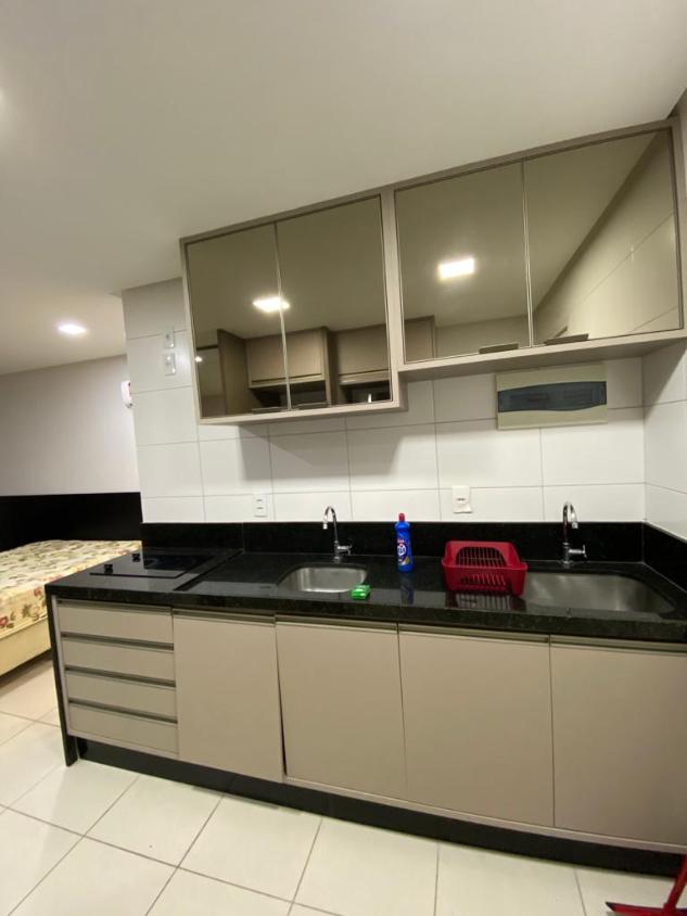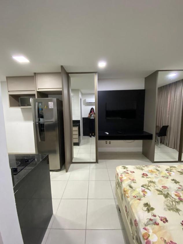 entregue totalmente mobiliada (cama box casal, ar-condicionado, TV, mesa e cortinas) e com cozinha equipada (fogão elétrico, micro-ondas e geladeira), além de fechadura eletrônica para maior praticidade e segurança.